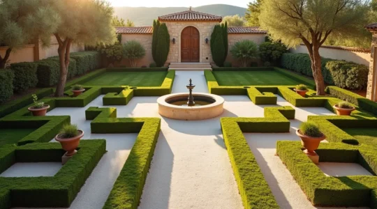 Los jardines de inspiración clásica se caracterizan por la simetría axial, el arte topiario (recorte escultural de setos de boj, tejo o aligustre) y elementos como grava decorativa clara que contrasta con el verde impoluto del césped. Este estilo transmite prestigio y orden, pero exige un mantenimiento semanal riguroso: recorte de borduras, riego abundante del césped y control estricto de malas hierbas. El coste anual de mantenimiento puede superar los 2.000 euros para un jardín de 200 m².
